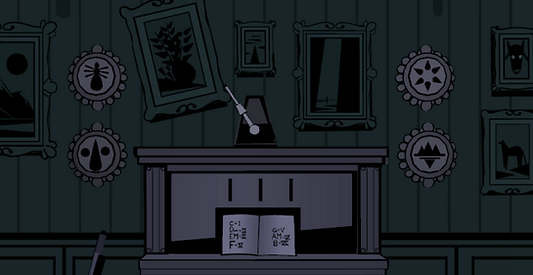 On the note is a melody that you need to reproduce using the black hearts. Once you do, a portal to the World Beyond will open, allowing you to take a stone disk. Turn around and insert the disk into the cabinet. You now have the Skull Key.