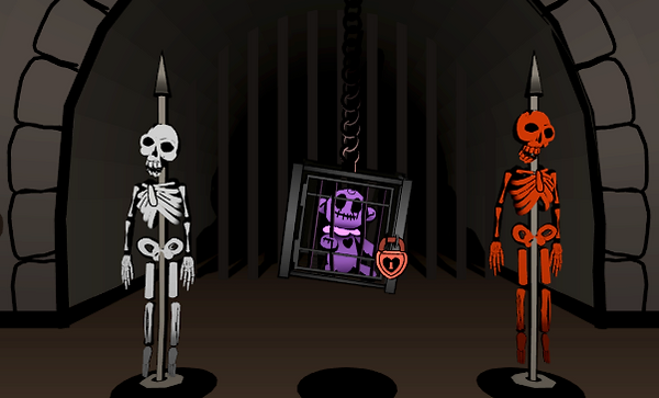 When you're finished with this sequence a tomb will be lit. Open the coffin to see an alien mummy boy resting inside. Click on it and receive a black heart key. Head back to the main room and unlock the cage to set the toy free and earn a black heart.