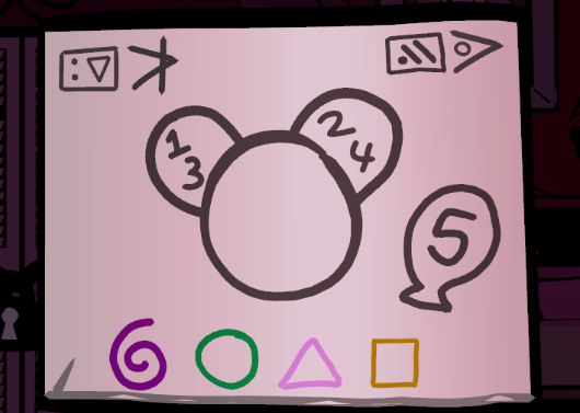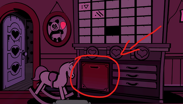The panda with the balloon corresponds to the panda painting beside the large wardrobe where Suzie hides. Press the panda’s ears and then the balloon in the order shown on the drawing: