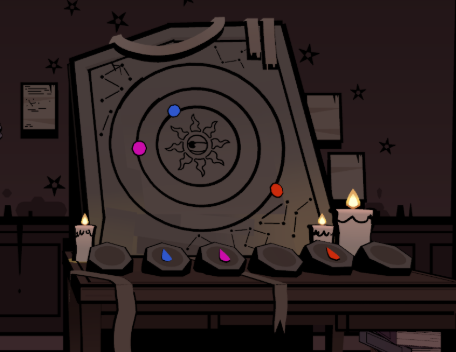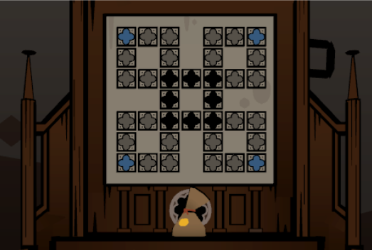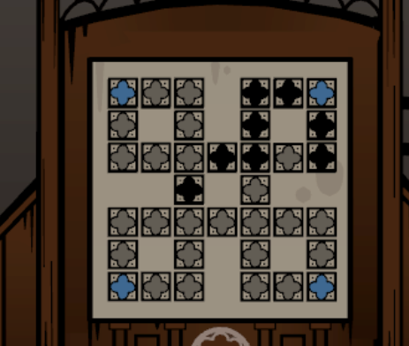 Put down the book and look at the wooden altar in front of you. Clicking in the middle of each big square will move all the tiles, and your job is to recreate the pattern. This one might be a bit harder than you imagine at first. Since when you get close to creating the pattern clicks that can advance you may also ruin another part of the pattern.