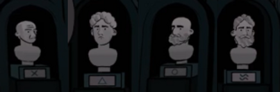 The solution lies in the symbols on the statues in the entrance hall—lines above a circle mean “hair” and lines below a circle mean “beard.”