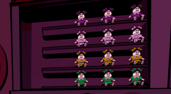 Doing so will reveal lines of dolls. You’ll need to arrange them so the colors of dolls match the symbols under the panda in the drawing. You may need to fiddle around the dolls to make space for them to move, but eventually you’ll need to arrange them in rows of matching colors.